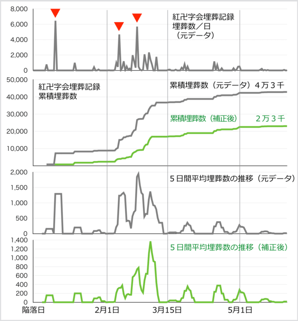 また、補正後の5日間平均グラフからは期限が迫った2月下旬の時点でも、1日あたりの平均的な埋葬数は1,000をなかなか超えないというのもわかる。丸山氏の回想でも、1,500体を毎日は無理とある。