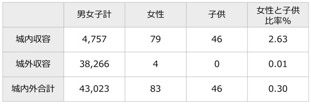 そして、城内外の合計値でも女性と子供の比率は0.3%にすぎない。