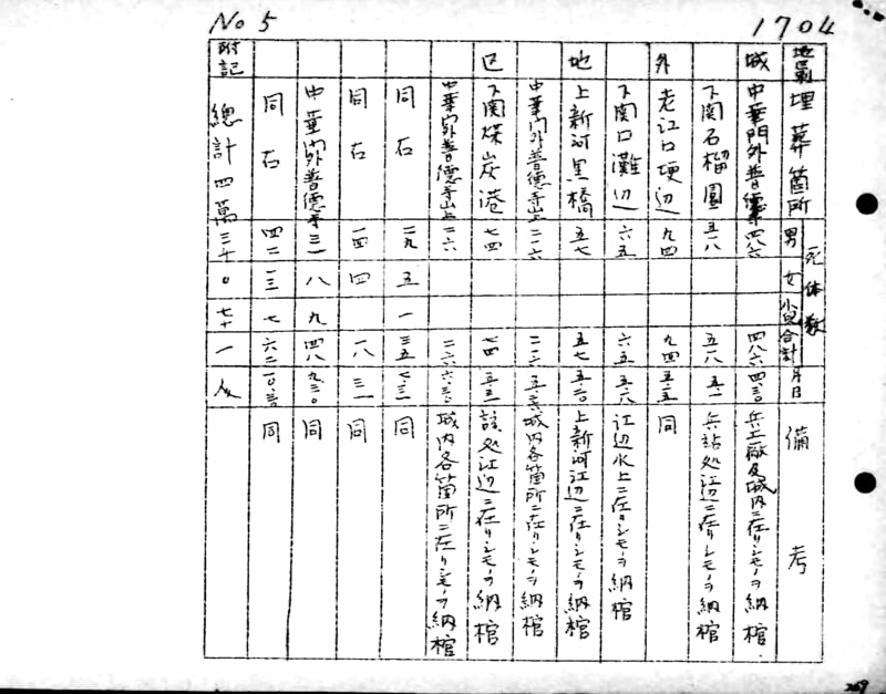 紅卍字会埋葬記録*に基づき、集計値を次のように算出した。