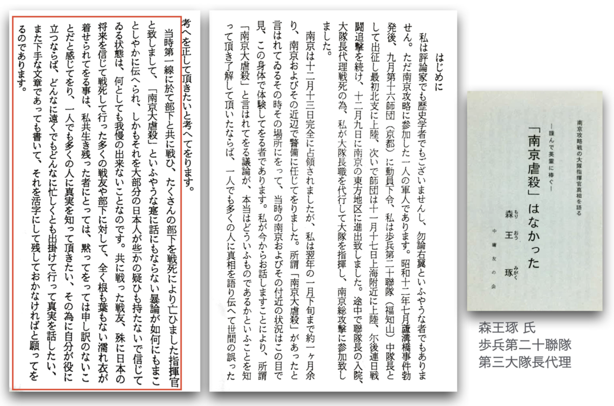 南京攻略戦で、歩兵第二十聯隊第三大隊長代理だった森王琢氏の講演録をまとめた小冊子。他の文献ではよくわからない戦場の実相がわかる。上の私の記事の末尾に一部抜粋してある。全文読めるサイトへのリンクもあり。この記事の末尾にも一部を画像で引用する。