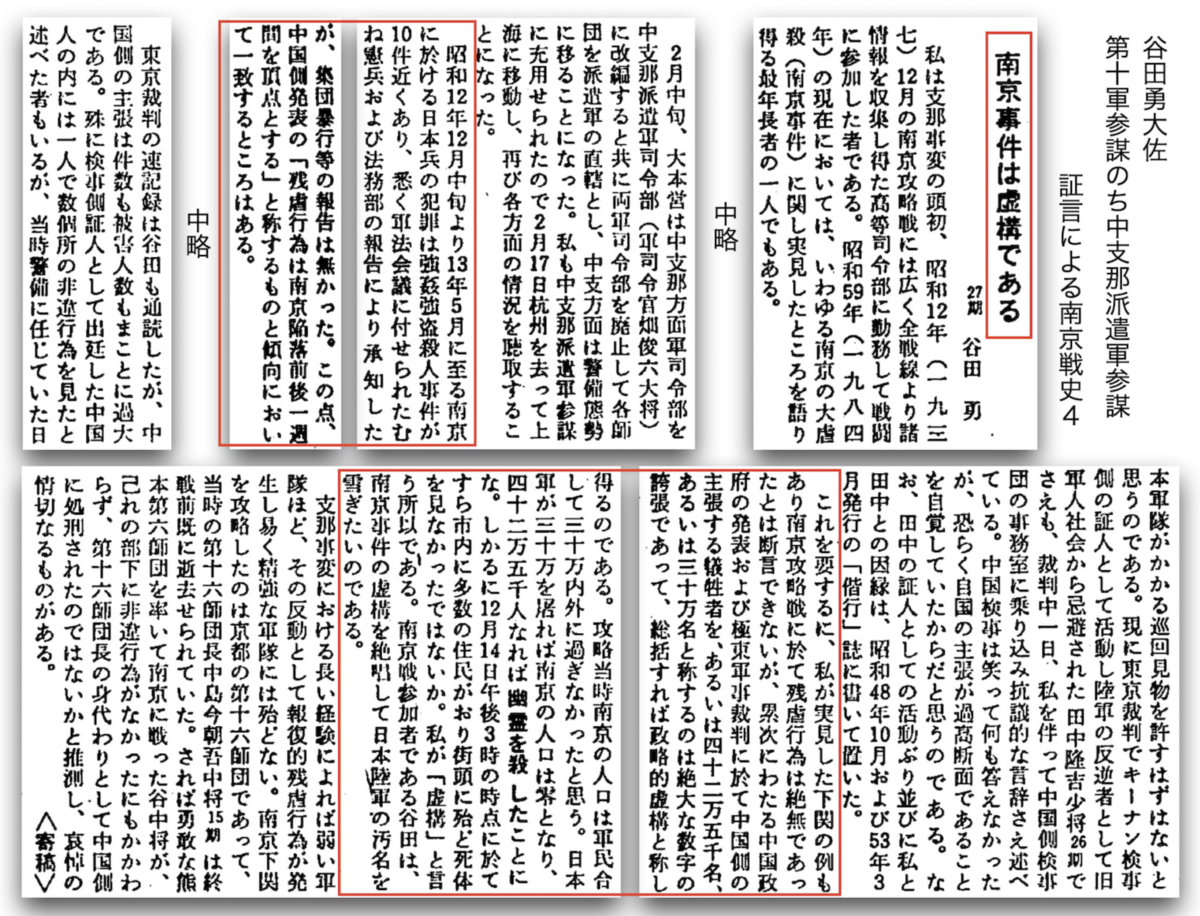 幻影系でいうと、やはり日本軍関係者からの反論が印象的。筆致はそれぞれであっても、根底にある想いは森王琢氏(歩兵第二十聯隊第三大隊長代理)が述べたようなことなのだろうと思う。一部の論者は、関係者が鬼籍に入る年代になってから否定論が始まったなどというが、そういうことではないのである。言論界が黙殺していただけなのだ。